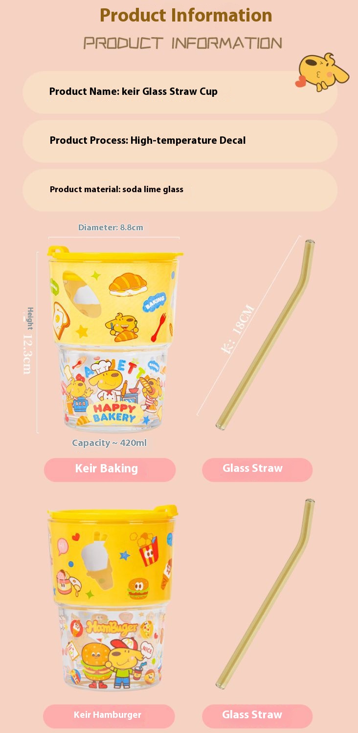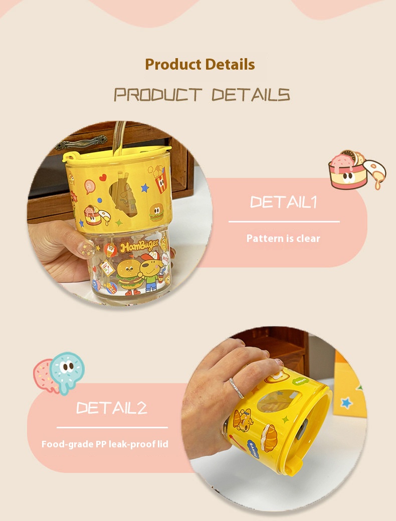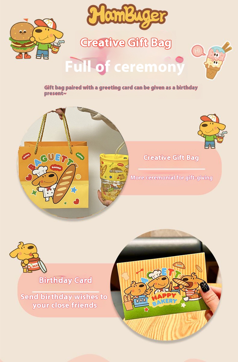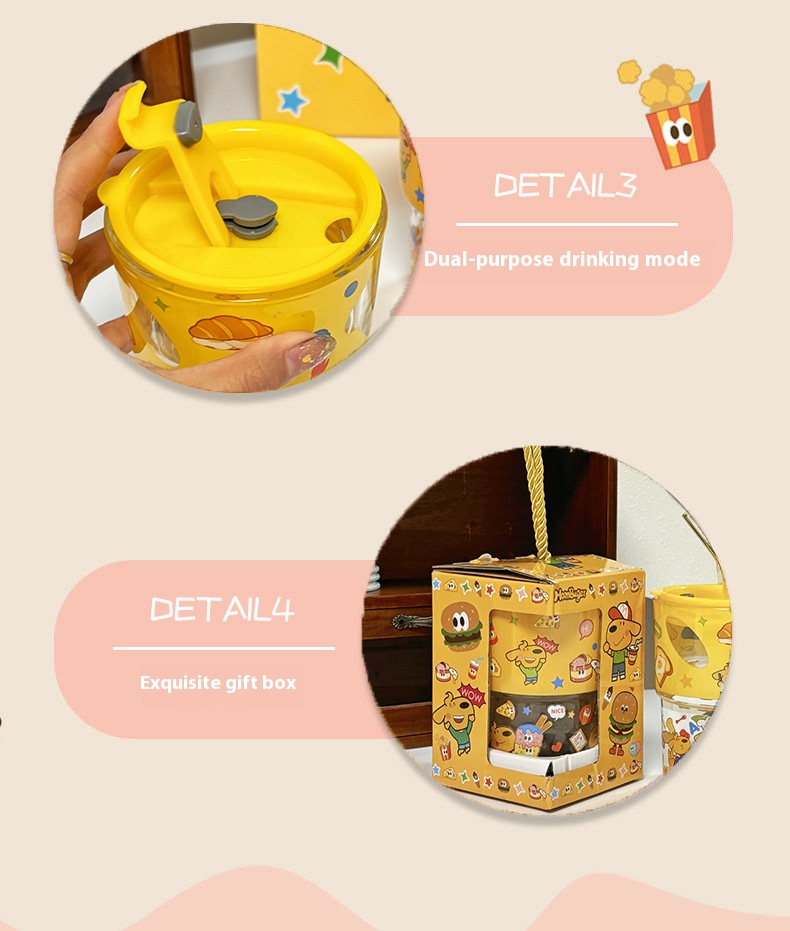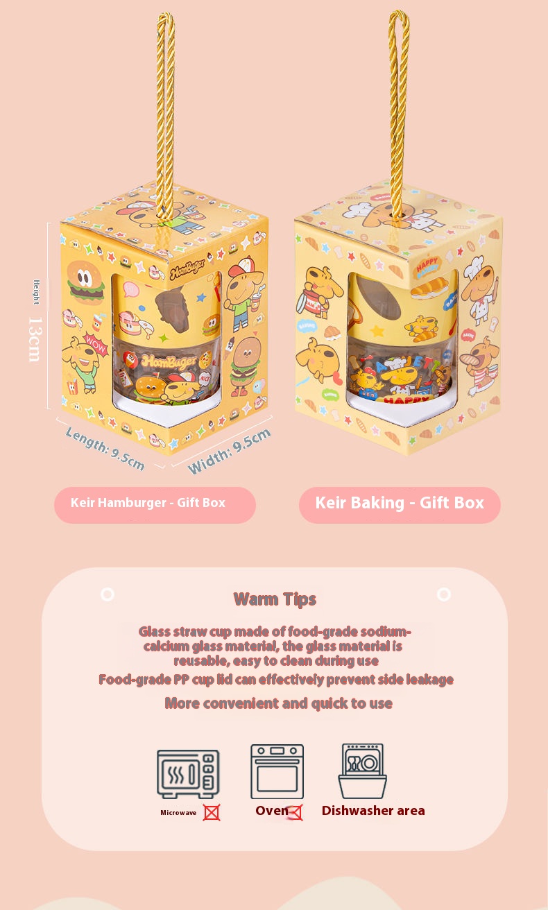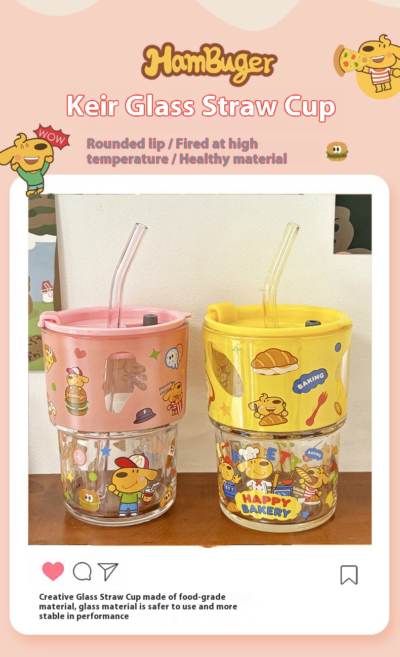 keir Dog Burger Printed Glass with Straw Cup Lid Gift Box Cute Cartoon Household Water Cup Birthday Gift